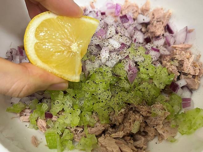 양파, 셀러리 다진 것을 넣은 다음 소금, 후추로 밑간을 하세요. 그래고 레몬즙을 짜서 넣습니다. 레몬즙을 넣으면 느끼함이 줄고 전체적인 맛이 깔끔해집니다. 또한 신선하고 산뜻한 풍미가 추가됩니다.