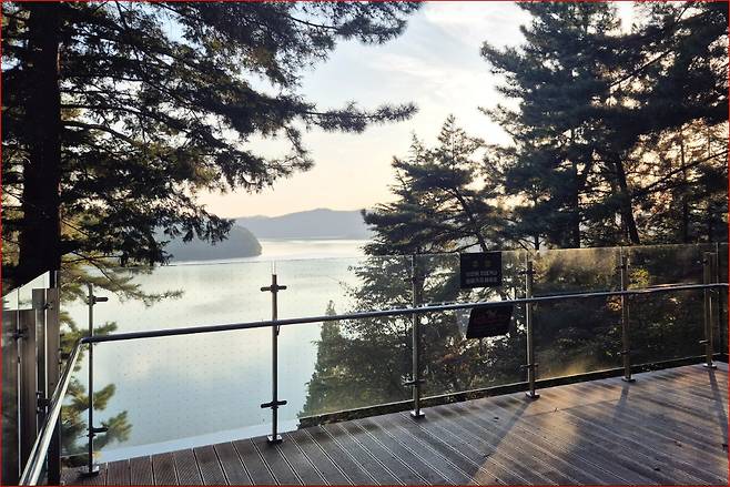 데크로드는 완만한 오르내림이 이어져 누구나 편안하게 걸을 수 있습니다. 초록이 대부분 빠졌지만 아직 숲 사이사이에 남아 있는 가을빛이 따뜻하게 느껴지네요. 나무 그늘 사이로 보이는 진양호의 수면은 호반전망대 에서 보는 것과는 또 다릅니다.