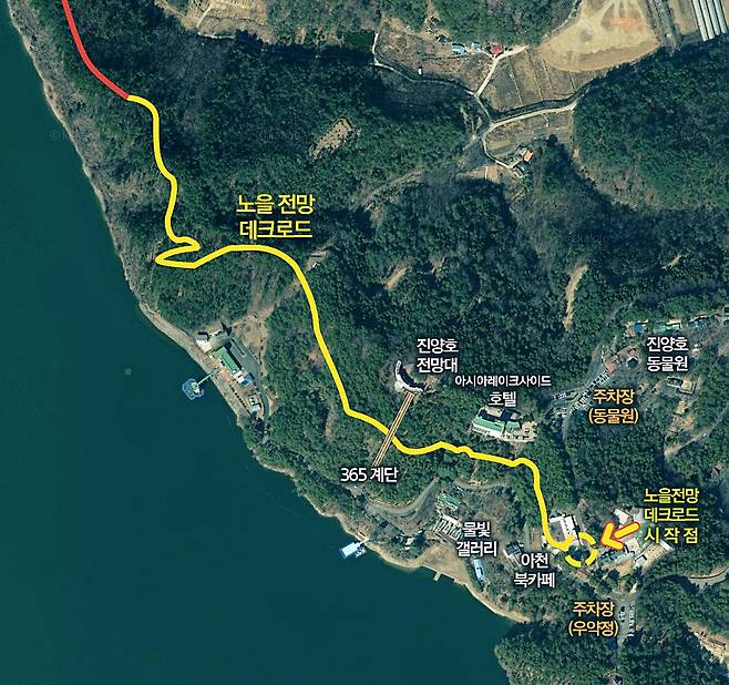 노을전망 데크로드는아천북카페 → 365 계단 → 양마산 입구 → 취수장 → 마당바위까지 이어지는 약 1.3km 코스입니다.