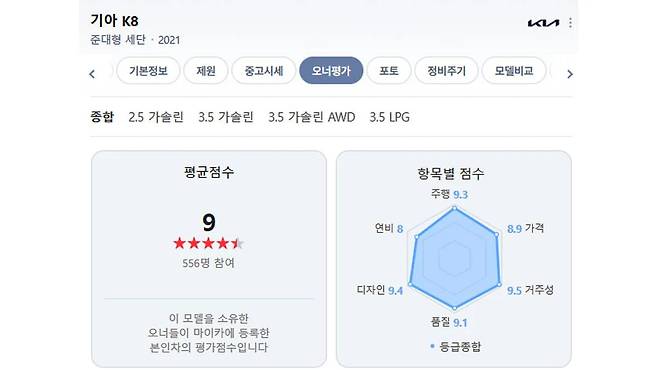 실제 오너들의 만족도도 높아 평균 평가점수는 9점대를 유지하고 있으며, 정숙성, 승차감, 장거리 운전 편의성에 대한 긍정적인 반응이 많다.
