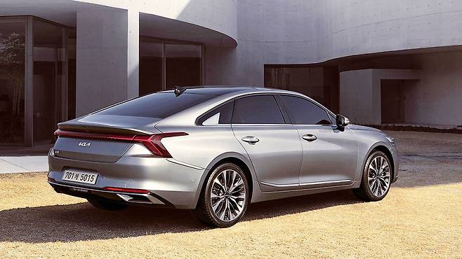 K8은 K7보다 한층 더 스포티한 인상을 주는 외관을 갖췄으며, 전장 5,015mm의 넉넉한 차체로 실내 공간 경쟁력도 확보했다.