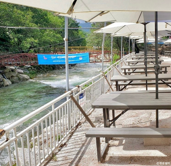다른 계곡 주변처럼 백숙이나 식사 강요 없이, 음료나 커피만 주문하면 파라솔 자리, 테이블, 샤워실, 화장실까지 모두 무료로 이용 가능해 가성비 갑 여름 피서지로 SNS에서도 입소문이 자자합니다.