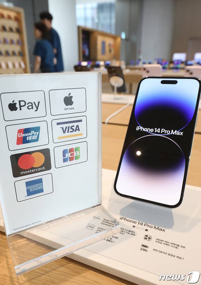 (서울=뉴스1) 송원영 기자 = 애플의 근거리무선통신(NFC) 결제 서비스 '애플페이'가 국내 서비스를 시작한 21일 서울 한 애플 스토어에 안내문이 놓여 있다.