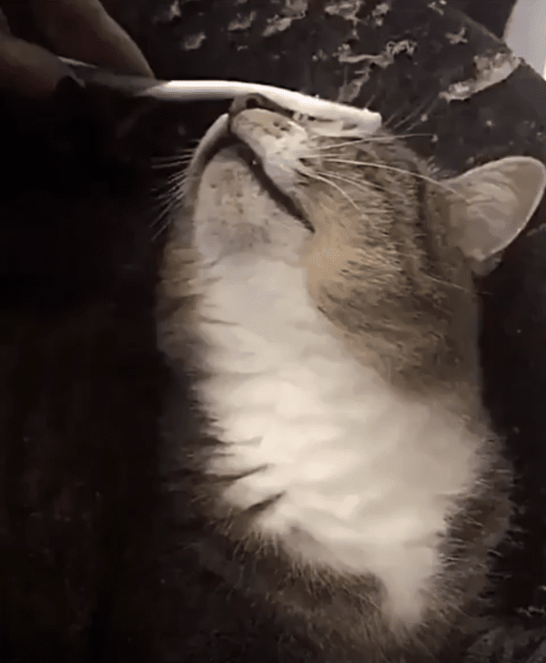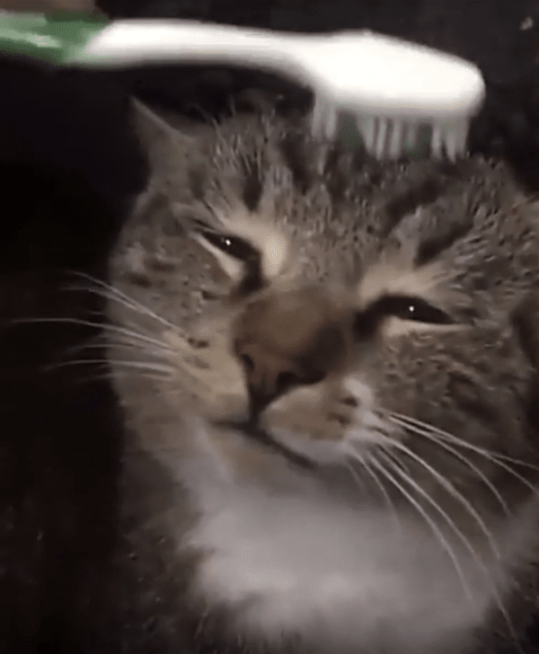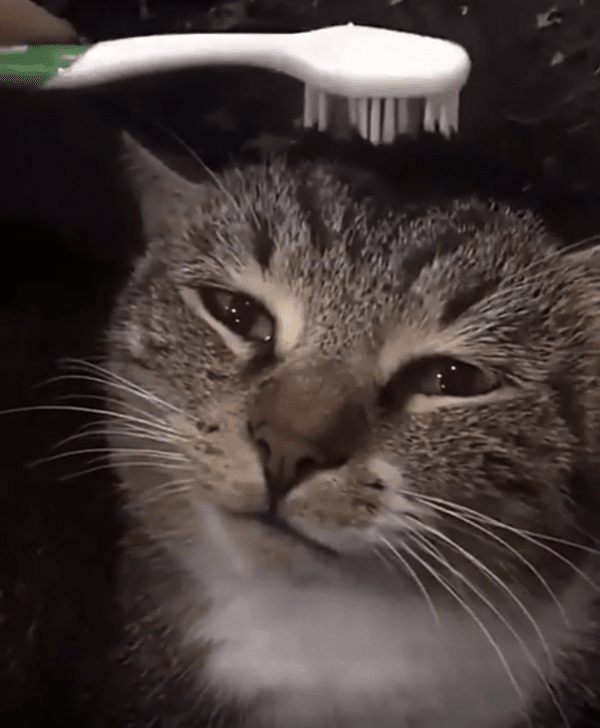 한 손에 쥔 젖은 칫솔이 고양이의 머리 위를 부드럽게 스쳤습니다. 놀랍게도 고양이는 순식간에 편안한 표정으로 변해 눈을 살짝 감으며 그 감촉을 온몸으로 느끼기 시작했습니다.