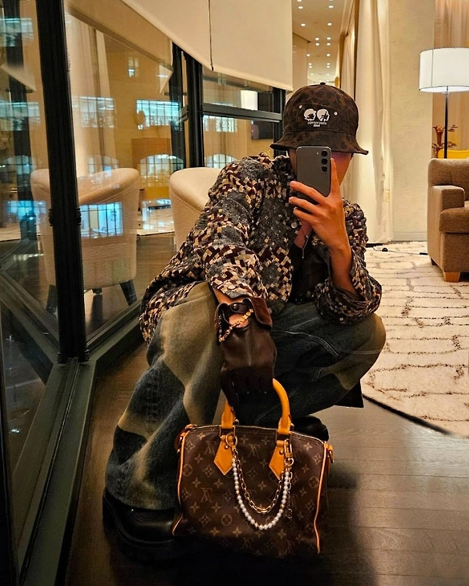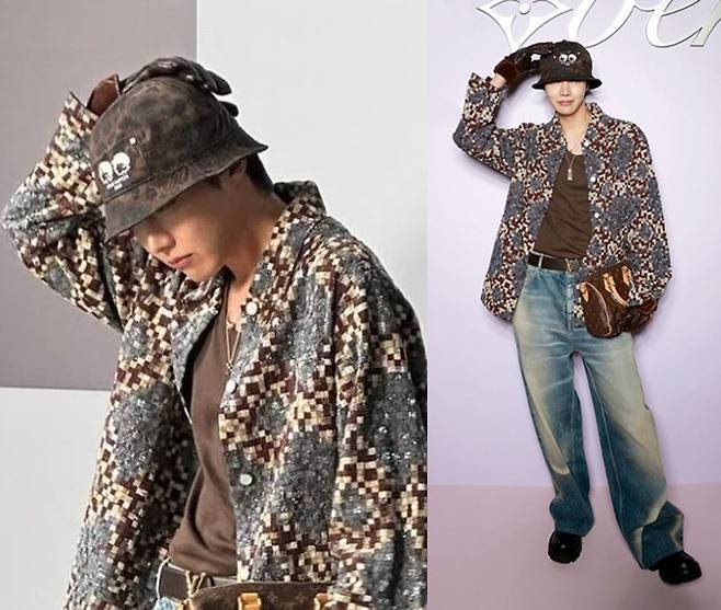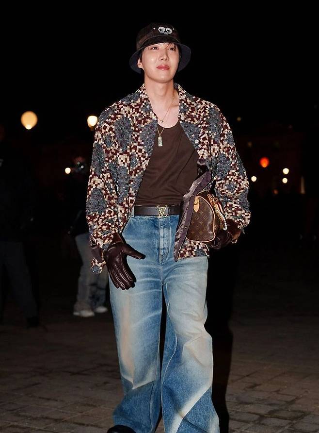 제이홉은 버튼 다운 셔츠와 데님 팬츠를, 여기에 버킷햇과 진주 스피디 백을 매치한 캐주얼하면서도 아니코닉한 스트리트 캐주얼룩을 선보이며 막강한 존재감을 뽐냈다.