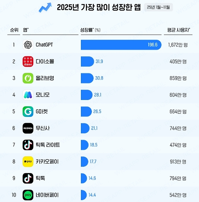 와이즈앱·리테일이 12월 10일 공개한 조사 결과에 따르면 챗GPT가 2025년 1월부터 11월까지 한국에서 가장 빠르게 성장한 앱으로 나타났다.
