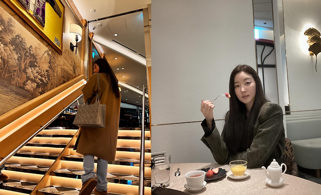 실내에서 티타임을 즐기는 김사랑은 벨벳 재킷을 선택해 고급스러운 질감을 강조했다. 차와 디저트가 놓인 테이블은 그녀의 우아한 라이프스타일을 보여주며, 재킷과 자연스럽게 흐르는 긴 머리 스타일이 전체적인 룩의 완성도를 높인다.
