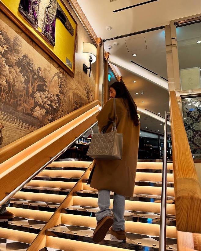 계단을 오르는 장면에서 김사랑은 베이지 톤의 롱 코트를 선택해 고급스러운 분위기를 자아냈다. 데님 팬츠와 브라운 슈즈를 매치해 클래식하면서도 캐주얼한 무드를 완성했으며, 손에 든 디올 백은 전체 스타일에 품격을 더하는 액세서리로 활용되었다.