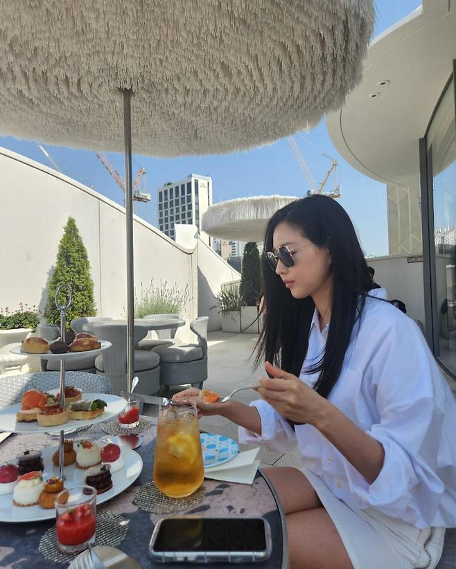 야외 테라스에서 김사랑은 화이트 셔츠와 미니 스커트를 착용해 깔끔하고 산뜻한 이미지를 선보였다. 티타임 테이블 위의 디저트와 음료는 그녀의 여유로운 일상과 잘 어우러지며, 전체적인 스타일은 심플하면서도 세련된 느낌을 준다.