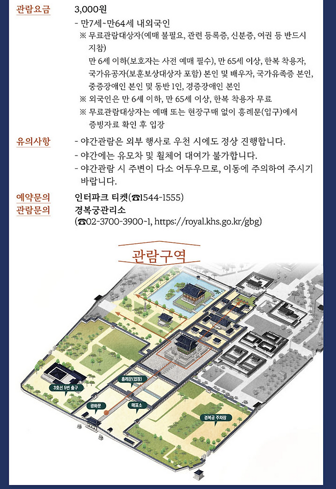 무료 입장 대상자도 일부 있습니다. 만 6세 이하, 만 65세 이상, 한복 착용자는 내·외국인 모두 무료 입장이 가능하며, 내국인에 한해 국가유공자 및 유족, 장애인 등의 대상도 포함됩니다. 단, 반드시 관련 증빙서류를 지참해야 하며, 한복 착용 시에는 문화재청이 정한 가이드라인에 부합하는 복장이어야 무료 혜택을 받을 수 있습니다.