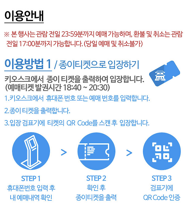 입장 방식은 두 가지로 구분됩니다. 첫째, 키오스크에서 종이 티켓을 출력하는 방식이 있으며, 광화문 매표소에서 발권 가능합니다. 둘째, 예매 시 카카오 알림톡으로 발송되는 모바일 티켓을 이용할 수도 있습니다. 모바일 티켓은 관람 당일 낮 12시 이전에 발송되며, 미수신 시 현장에서 종이 티켓으로 대체 가능합니다. 두 방식 중 하나만 선택해 사용할 수 있으니, 사전에 입장 방법을 정해두는 것이 좋습니다.