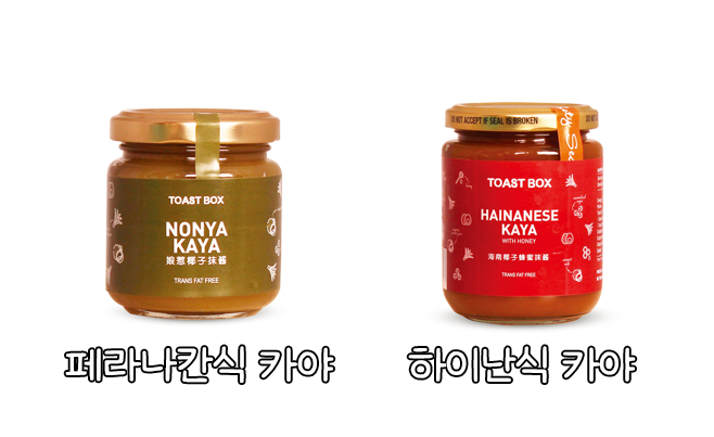 카야 잼은 판단 잎의 양이나 설탕의 농도와 색에 따라 색깔과 맛이 달라집니다. 초록색보다는 조금 연하고 연두색보다 짙은 '풀색' 카야는 페라나칸식이고, 설탕이나 꿀을 넣어 갈색을 띠는 것이 하이난식 카야 잼입니다. 참고로 야쿤 카야 토스트와 동아 이팅 하우스는 페라나칸식이고, 토스트 박스는 하이난식에 가까운 카야를 씁니다.