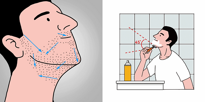 면도날은 피부에 약 45도 각도로 닿는 것이 가장 이상적이다. 면도날을 너무 눕히면 수염이 제대로 밀리지 않고, 반대로 90도에 가깝게 세우면 피부에 날이 직접 닿기 때문에 상처가 생기기 쉽다.