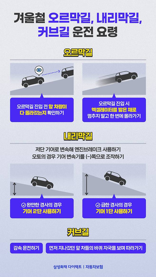만약 오르막길, 내리막길 또는 커브길에 눈이 쌓여있거나 도로가 얼어있다면 더더욱 조심해야 합니다. 먼저 오르막길에서는 멈추지 않는 것이 중요한데요. 평지에서 출발 후 오르막길에 진입했을 때 꾸준히 액셀레이터를 밟아 멈추지 말아야 합니다. 브레이크를 밟았다 떼는 순간 차량이 뒤로 밀릴 수 있기 때문입니다. 이에 오르막길 진입 시에는 앞차가 다 올라갔는지 확인한 뒤 출발하는 것이 좋습니다.
