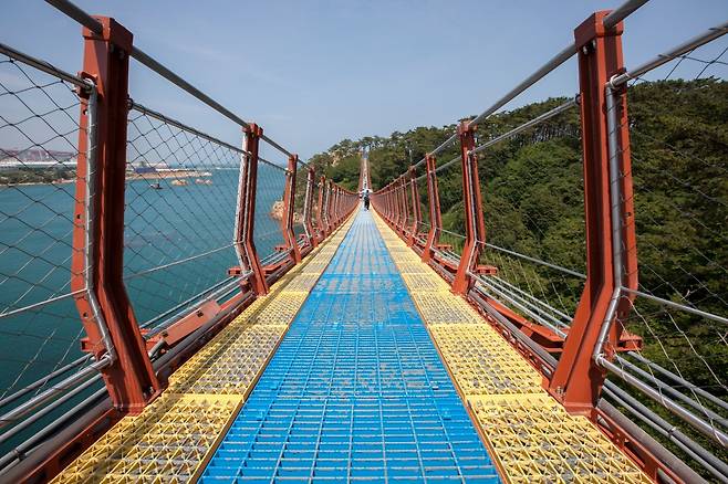 울산 동구 등대로 140에 위치한 대왕암공원 출렁다리는 첫발을 떼는 순간부터 가슴이 두근거리는 긴장감이 느껴지는 곳이에요. 길이 303m, 높이 42.55m의 웅장한 스케일은 물론, 중간에 지지대가 없어 흔들림이 더욱 생생하게 전해집니다. 이곳은 최대 1,285명(성인 70kg 기준)까지 버틸 수 있도록 풍동실험을 거쳐 안전성을 확보했답니다.