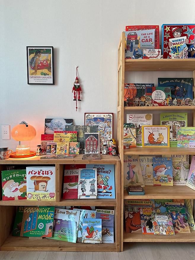 저희 집에서 가장 독특하다고 할 수 있는 공간은 바로 동화책 선반이에요. 외국어로 된 동화책을 모으는 건 제 오랜 취미 중 하나였는데요. 사실 그동안은 다른 곳에 책을 숨겨두고 있었습니다. 추구하던 인테리어 디자인과 어울리지 않았던 것이기 때문이었죠. 하지만 미드 센추리 모던을 추구하게 되며 드디어 이 수집품들이 거실 한 벽면을 채우게 되었고 마치 소품샵 쇼룸처럼 당당히 빛을 보게 되었습니다.