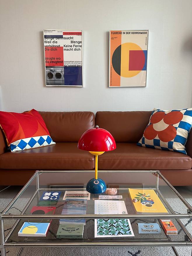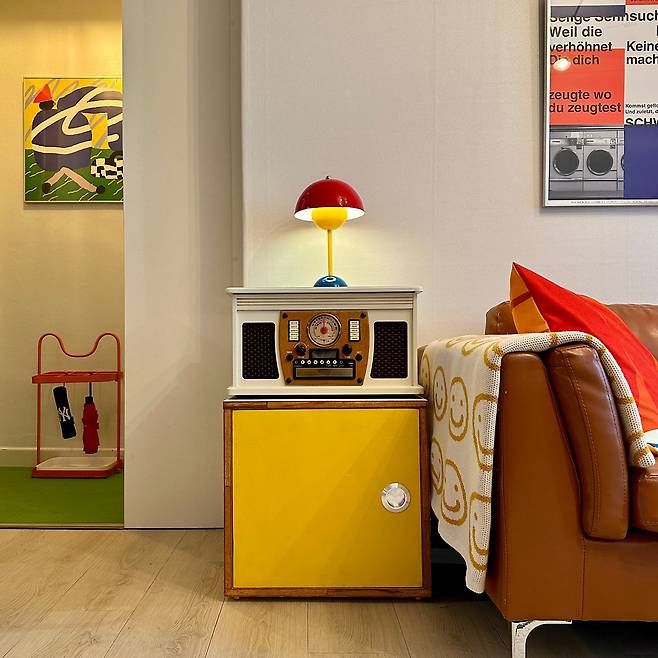 그다음으로 중요하게 생각하는 것은 컬러가 차지하는 면적입니다. 면적이 클수록 그 공간의 컬러 제품 수를 적게 두고, 면적이 작으면 개수를 늘려 스타일링을 하고 있거든요. 또 컬러가 여러 가지인 만큼 5개의 색상이 대등한 비율로 구성되게끔 배치하고 있습니다. 컬러를 활용하면 가죽, 철제, 목재, 패브릭 등 동떨어진 소재들을 부드럽게 하나로 묶을 수 있다는 것도 컬러 매칭의 장점인 것 같습니다.
