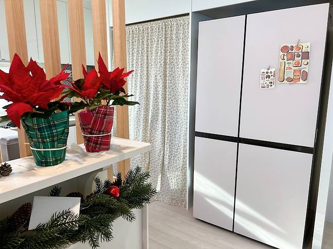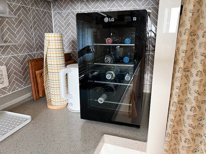 냉장고장 옆 안쪽 공간에는 플레이팅 도마와 미니 와인셀러가 숨겨져 있어요. 이 와인셀러는 남편의 콜라 냉장고가 되기도 하고 제 소주 냉장고가 되기도 하는 없어서는 안될 소중한 친구랍니다:)