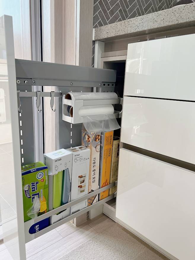 기존 싱크대 하부장 양념 칸에는 비닐팩, 지퍼팩, 호일 등을 보관하는 용도로 사용 중이에요. 기가 막히게 딱 맞는 사이즈에 혼자서 얼마나 감탄을 했던지:) 마치 처음부터 이 용도가 아니였을까 생각될 정도로 보관하기가 좋아서 많은 분들께 이 수납 방법을 공유하고 싶었어요!