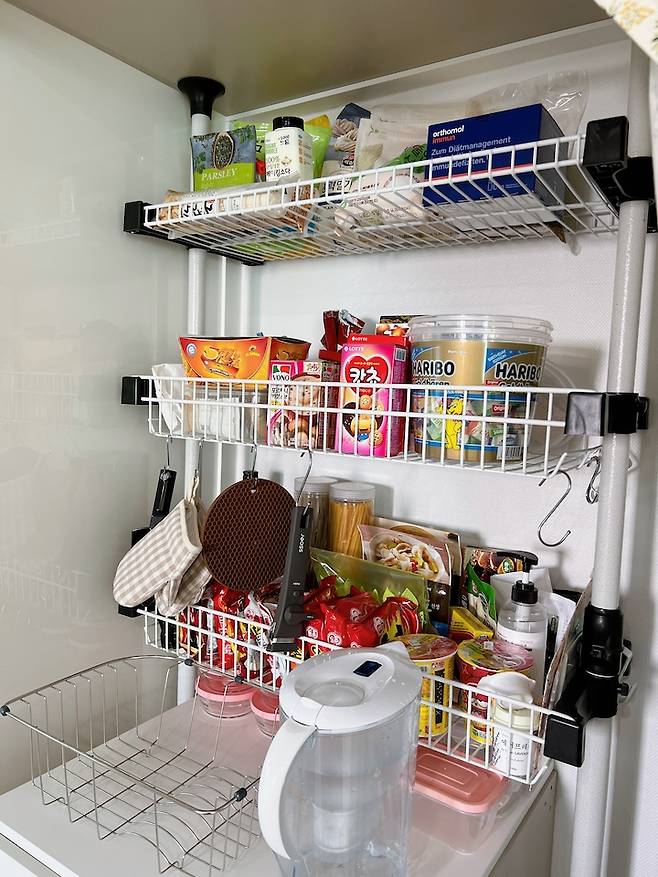 이전 집에서 사용하던 행거를 버리지 않고 미니 팬트리로 만들어 보았어요. 식료품 코너, 남편 간식 코너 등으로 쏠쏠하게 사용하고 있는데, 나름 정리를 한다고 해도 어수선해보여서 항상 골치 아프게 하는 애증의 공간이기도 해요.
