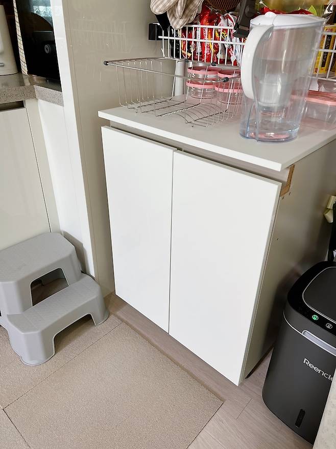 식기세척기를 설치하면서 떼어낸 하부장은 퇴거시 복구를 해야 하기 때문에 잘 보관해야 해요. 하부장을 떼내고 보니 윗부분이 뚫려있어서 사용하기에 난감했었는데 맞는 사이즈의 상판을 찾아 올려놓으니 원래 있었던 것 마냥 감쪽같더라고요.