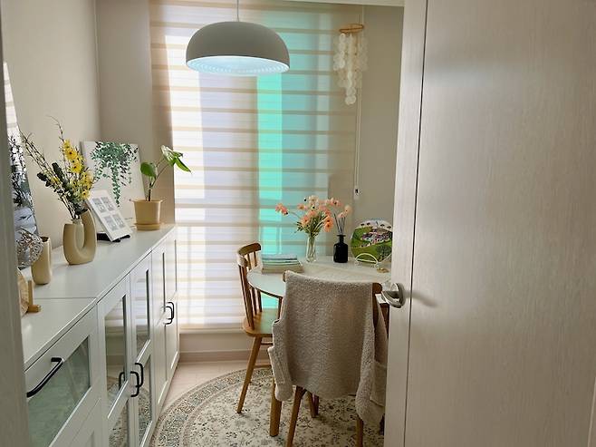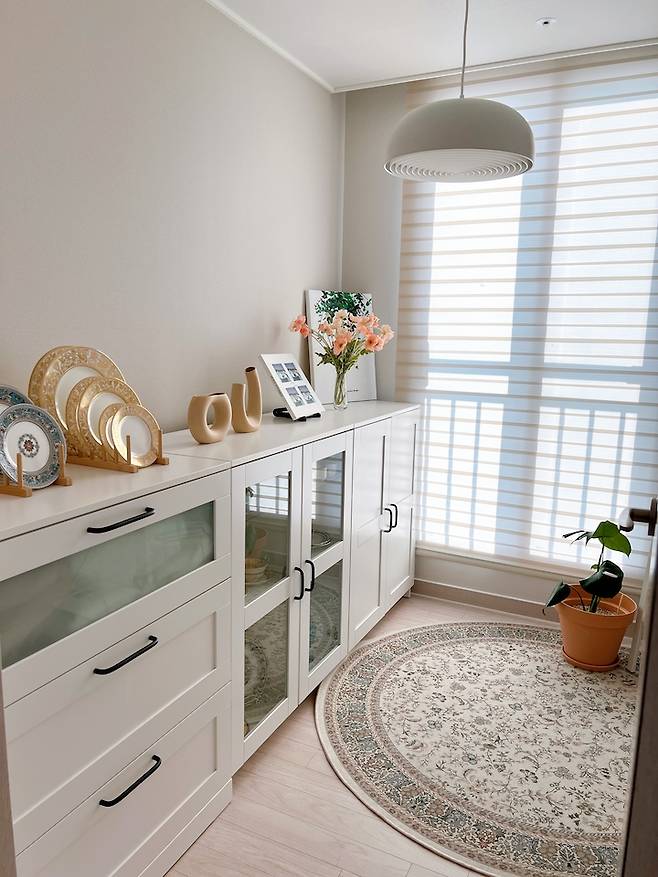 신혼희망타운에 입주하는 분들이 가장 고민하는 공간이 바로 알파룸인 것 같아요. 집에 있는 시간이 많은 제가 주로 머무를 소박한 공간을 고민하던 중, 예쁜 그릇과 컵을 모으는 것을 좋아하니까 그릇장을 사는 것이 어떻겠냐는 남편의 의견에 힘입어 알파룸을 저만의 공간으로 꾸미게 되었어요 .수납장들은 이케아에서 같은 라인으로 구매하였는데 맞춤가구처럼 한 쪽 벽에 쏙 들어가더라고요. 손잡이가 마음에 들지 않아서 사이즈에 맞는 제품으로 교체하여 달았더니 또 다른 가구로 변신하였어요. 화이트 수납장에 블랙 손잡이가 정말 잘 어울리지 않나요?:)