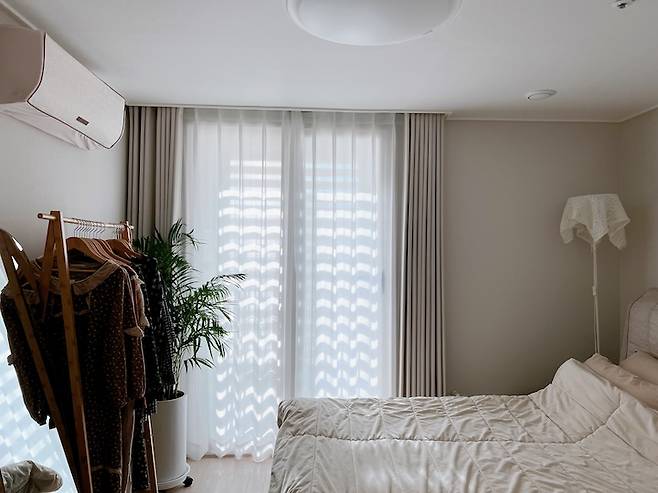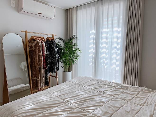 침대 맞은편에는 출근길 옷 매무새를 확인할 전신 거울과 저희 부부의 파자마 옷걸이가 있어요. 둘 다 파자마가 생각보다 편하다는 사실을 알게 된 후 하나하나 모으다 보니 어느새 따로 공간을 만들어야 할 만큼 많아졌더라고요. 그래서 안방에 파자마 옷걸이를 따로 설치하게 되었는데, 제법 튼튼해서 하나 더 구매하여 남편방 옷걸이로도 사용 중이예요.