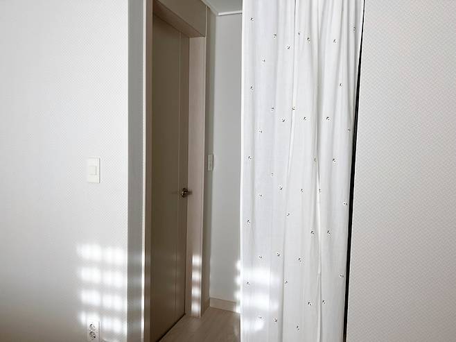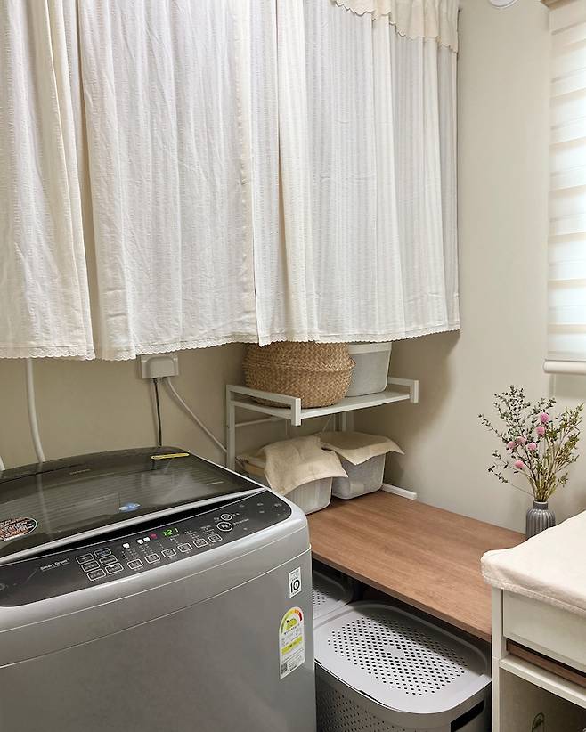 이불빨래를 자주하기 때문에 과감하게 워시타워는 포기하고 통돌이 세탁기를 사용하고 있어요. 건조기를 사용하지 못해서 아쉽지만 다용도실을 알차게 사용하고 있다는 자부심으로 위안하고 있답니다:) 기존에 설치되있던 선반을 떼는 건 어려울 것 같아서 커튼으로 가려 놓았더니 깔끔하게 정리하지 않아도 깨끗해 보여서 만족해요.