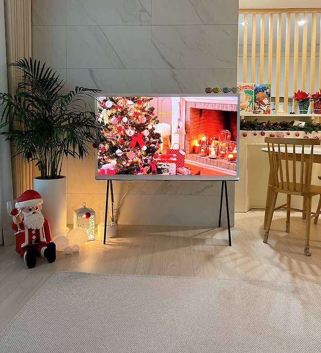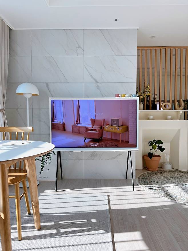 세리프 티비는 쉽게 옮길 수 있고 어디에 두어도 예쁘다 보니 사이즈는 좀 작아도 만족스럽게 사용하고 있어요. 세리프티비를 사고 싶었던 또 하나의 이유는 위에 예쁜 소품들을 올려놓을 수 있다는 장점 때문이였는데요. 이사 선물로 받은 컵이 오브제가 되어서 밋밋한 티비 위에 예쁜 포인트가 되어주고 있답니다. 나중에는 인형이나 작은 다육이를 올려두어도 좋을 것 같다는 생각이 들어요.