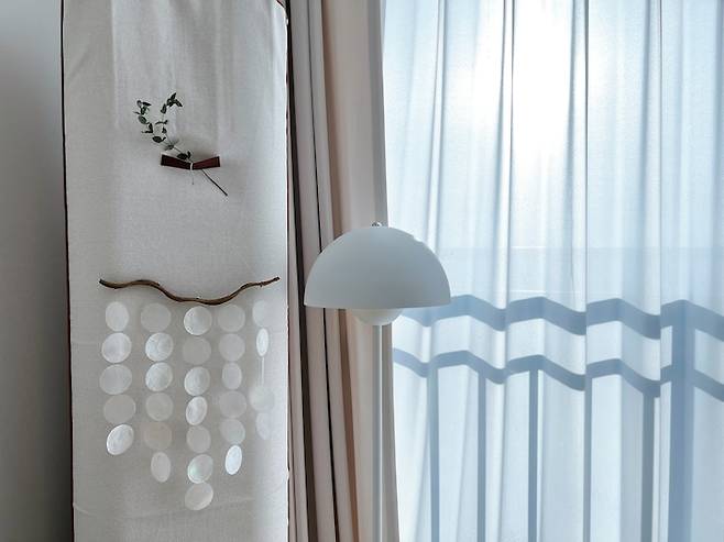 거실 천장에 모빌을 달고 싶어서 당근마켓에서 자개모빌을 구매해서 에어컨에 잠깐 걸어놨었는데 찰떡같이 어울려서 그대로 두게 되었어요. 사이즈며 디자인이며 이 곳에 걸어두라고 만든 것 같지 않나요? 여름이 올 때까지 이 모빌은 이 자리에 예쁘게 자리 잡고 있을 것 같아요!