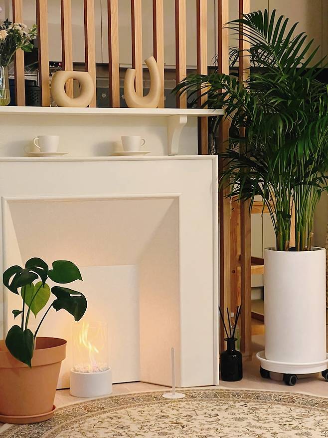밤에는 벽난로 콘솔 앞에 앉아 불멍을 즐기기도 하는데요. 밤에는 불을 끄고 간접조명으로만 생활을 하기 때문에 이 귀여운 화로도 하나의 조명으로서 역할을 톡톡히 해주고 있어요. 저희 부부에게는 이곳이 단순히 예쁘게만 꾸며 놓은 곳이 아니라 오늘 하루 있었던 이야기들을 꽃 피우는 소중한 공간이랍니다.
