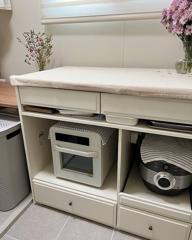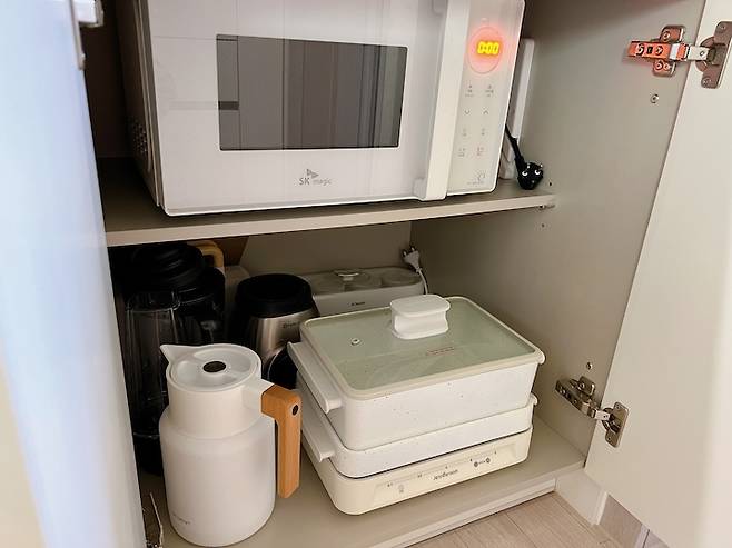 아일랜드 식탁 하부장에는 전자레인지와 소형 주방 가전이 자리 잡고 있어요. 제가 입주한 아파트는 아일랜드 식탁 상판에 콘센트가 설치되어있어서 하부장에도 콘센트가 연결되어있더라고요. 그래서 전자레인지를 이 곳에 설치하였더니 사이즈도 딱 맞고 사용하기에도 편해서 만족하고 있어요.