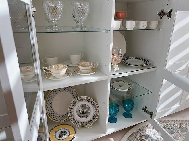자주 사용하는 컵과 그릇을 보관하는 곳이예요. 나름 예쁘게 정리하려고 하는데 생각보다 어렵더라고요. 고블렛잔부터 커피잔 그리고 소주잔까지 각 칸 별로 구분해서 보관하고있는데, 이사하면서 정리하다보니 금방 차버려서 하나 더 장만해야하나 고민중이랍니다.