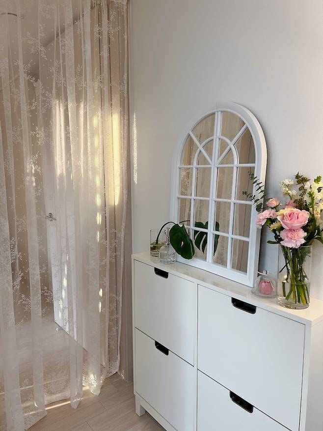 다음 소개해드릴 곳은 둘만의 소중한 공간인 침실이예요. 침실로 들어가는 입구 벽면이 생각보다 넓어서 그냥 두기에는 아깝더라고요. 고민 끝에 이케아에서 신발장으로 나온 제품을 수납장으로 사용하기로 했어요. 마스크와 자주 사용하는 생필품 등을 넣어두니 바로 바로 꺼내 쓸 수 있고 다양한 오브제와 꽃, 아치형 거울을 두니 또 다른 포토존이 된 것 같아서 볼 때마다 기분이 좋아요.