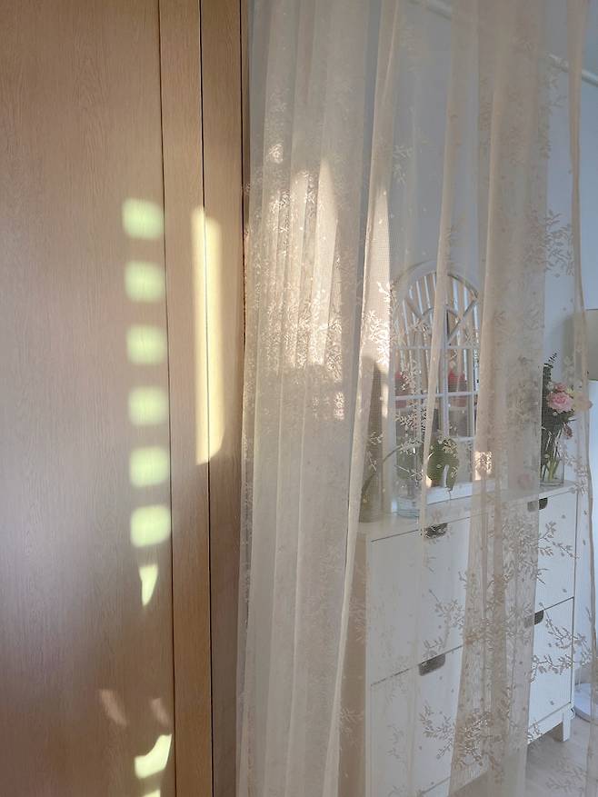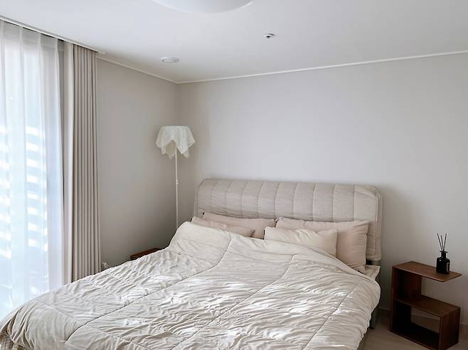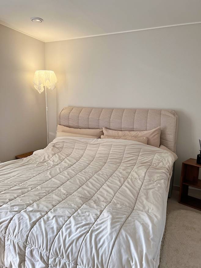 침실이 밝은 건 부담스러워서 간접조명이 좋을 것 같아 침대 옆쪽으로 스탠드조명을 놓았어요. 이전 집에서 사용하던 걸 그대로 들고 와서 레이스천 하나를 무심한 듯 툭 얹어주니 제법 예뻐보여서 만족스럽더라고요. 침대 바로 옆에 있으니 바로 끄고 켤 수 있어서 편하면서도 따뜻한 분위기를 내주고 있어서 꾸준히 두고 사용할 것 같아요.