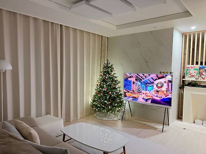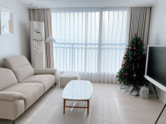 요즘 크리스마스 준비로 바쁜 거실의 모습이예요. 크리스마스 맞이로 거실 한 켠에 트리를 설치했어요. 밤마다 반짝반짝 예쁘게 빛나는 모습이 예뻐서 트리 멍하며 시간을 보내는데 정말 기분 좋더라고요! 좁은 거실 인테리어의 꿀팁은 큰 화분이나 큰 가구는 입구에서 대각선으로 보이는 방향에 두어야 조금이라도 넓어보인다는 것이예요. 그래서 크리스마스 트리 역시 입구에서 대각선 방향 쪽으로 설치하게 되었답니다:)