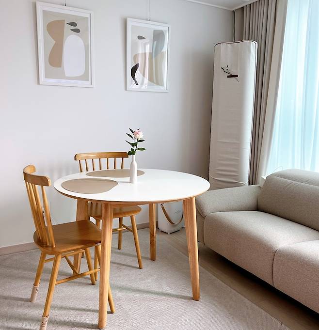 원형 테이블은 집을 카페로 만들어주는 존재감 넘치는 감성적인 가구인 것 같아요. 소파의 위치에 따라 원형테이블의 위치도 같이 바꿔주고 있는데, 전 개인적으로 이 거실 구조가 가장 편하고 마음에 들었답니다. 소파와 테이블이 가까이 있는 것이 그렇게 편할 수가 없더라고요!