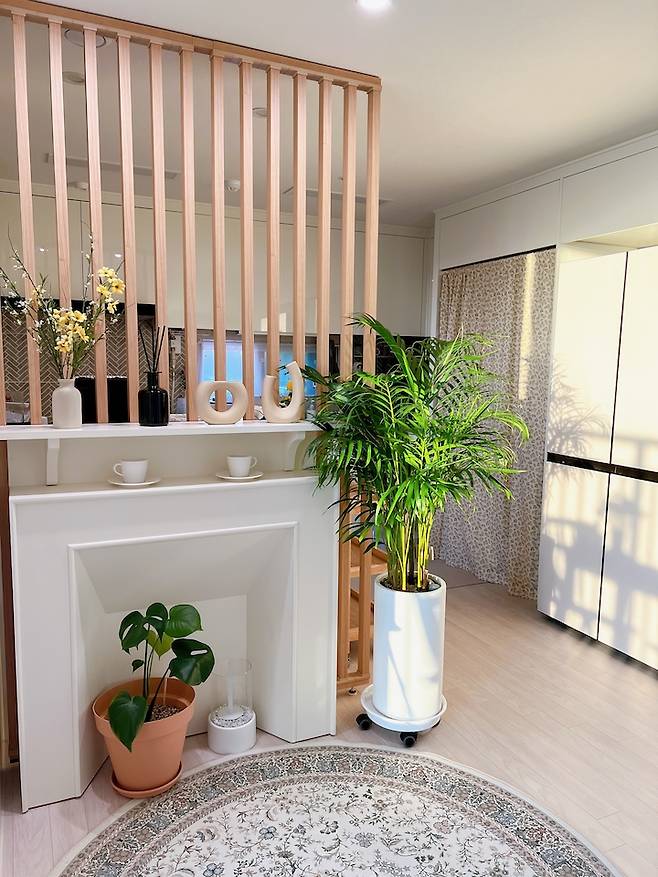 가구들 중 가장 고민에 빠지게 했던 것이 바로 이 벽난로 콘솔이였는데요. 고민 끝에 파티션 앞에 두었더니 아일랜드 식탁에 올려둔 소형가전들을 가려주면서도 감성적인 공간이 만들어져서 정말 만족스러웠답니다. 계절마다 특별한 날마다 컨셉에 맞게 꾸며주고 있는데, 좋아하는 커피잔과 예쁜 오브제들, 그리고 제일 애정하는 식물들과 함께 꾸며 놓으니 제법 예쁜 포토존 같지 않나요?:)