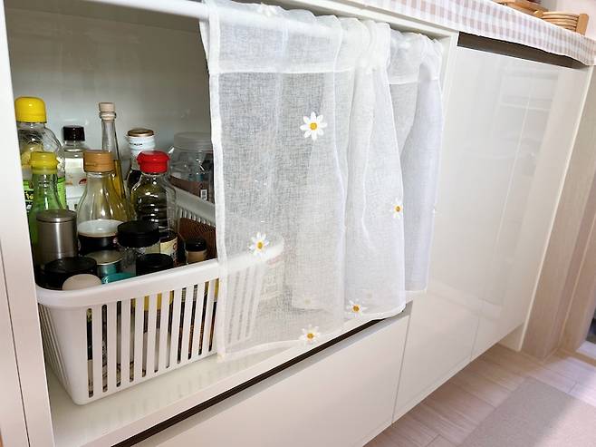 아일랜드 식탁에 있는 전자레인지 장은 양념장 코너로 사용하고 있어요. 기존에 설치되어있는 양념 칸은 사이즈도 작고 좁아 정리하기 어려워서 과감하게 전자레인지 장에 놓았는데 음식 할 때 정말 편하더라고요. 꺼내기도 좋고 좁은 양념 칸에 맞추려고 통을 별도로 구매하지 않아도 되니 일석이조! 그래도 너무 보여지는 건 신경이 쓰여서 다이소에서 사온 커튼으로 가려주었더니 나름 깔끔해 보여서 만족해요.