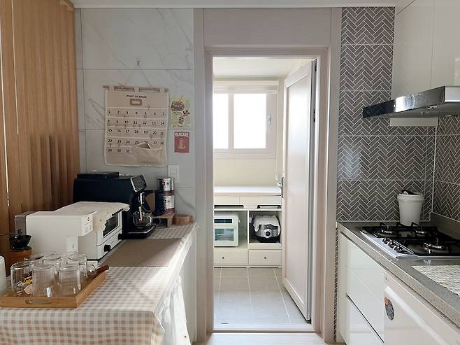 주방 옆 쪽으로는 다용도실이 있는데, 생각보다 넓어서 보조주방 겸 사용하고 있어요. 이전 집에서 사용하던 렌지선반을 놓았더니 사이즈가 아주 딱 맞더라고요. 덕분에 좁은 주방에 놓기 애매한 소형가전과 기타 작은 물건들을 수납할 수 있어서 정말 좋아요.