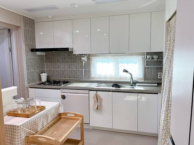 두 번째로 소개해드릴 공간은 제가 하루 중 가장 많이 머물러있는 공간인 주방이예요. 주방의 분위기를 결정짓는 중요한 포인트는 타일색과 무늬라고 생각하는데 음.. 생각이 많아지더라고요:) 마음대로 타일덧방을 할 수는 없으니까 바로 포기하고 깔끔하게만 하고 살자라는 생각으로 열심히 정리했더니 나름 만족스러운 주방이 되었답니다.