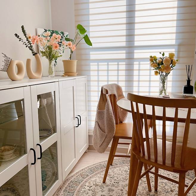 꽃과 식물을 좋아해서 꾸준하게 생화를 두는 편인데, 요즘은 꽃가게에 갈 시간이 부족해서 조화로 대리만족하고 있어요. 예쁜 팬던트 조명과 오브제들 그리고 알록달록 초록초록한 것들이 함께하니 여느 카페가 부럽지 않은 예쁜 공간이 된 것 같아서 만족스러워요.
