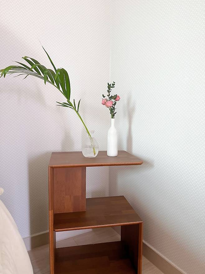 침대만 구매하여 협탁없이 사용하다가 이사오면서 예쁜 협탁을 하나 장만하게 되었어요. 독특한 디자인에 우드감성을 살릴 수 있는 제품으로 골라보았는데, 청소하면서 살짝 대각선으로 밀어 놓은 상태가 은근 인테리어에 신경 쓴 것처럼 보여서 매일 이대로 각맞추고 있는건 비밀 아닌 비밀이예요:)