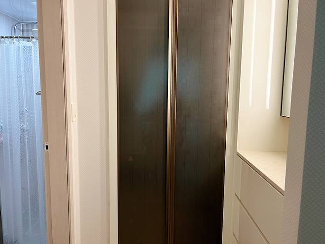해가 예쁘게 들어오는 침실 한 쪽 편에는 드레스룸과 파우더룸, 화장실이 자리 잡고 있어요. 작지만 알찬 공간이라 입주 당시 저희 부부가 가장 만족했던 곳이였어요. 화장대 위에 물건들이 나와있는 것을 좋아하지 않아서 보이지 않게 수납했더니 청소하기도 편하고 깔끔해 보여서 좋아요. 정리 정돈과 친하지 않은 남편도 이 곳 만큼은 깨끗하게 사용하고 있어서 칭찬을 듬뿍 받고 있어요!