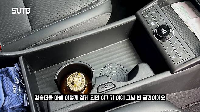 기어가 이제 컬럼식으로 올라갔잖아요. 가운데 기어가 없어서 공간이 있고, 컵홀더도 가변식으로 돼 있다 보니까 컵홀더를 아예 접게 되면 그냥 빈 공간이 돼요. 그래서 이곳을 온전히 다 수납공간으로 쓸 수가 있기 때문에 이런 부분에서는 굉장히 현대가 잘 해주고 있는 것 같습니다. 역시 이런 거는 국산차가 최고인 것 같아요.