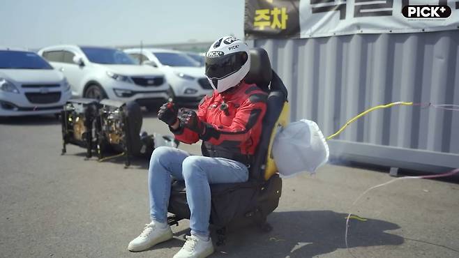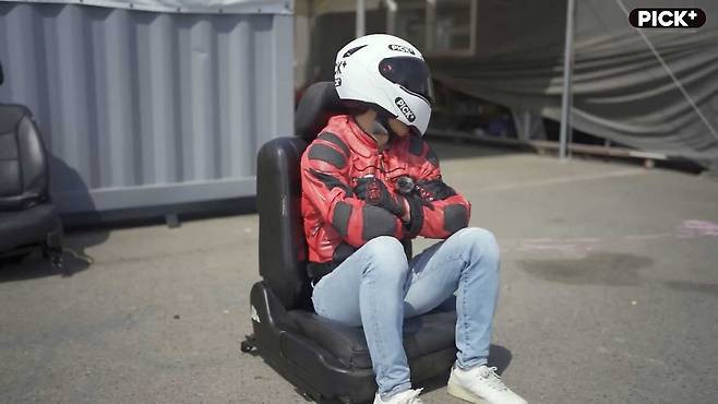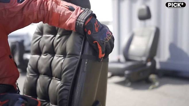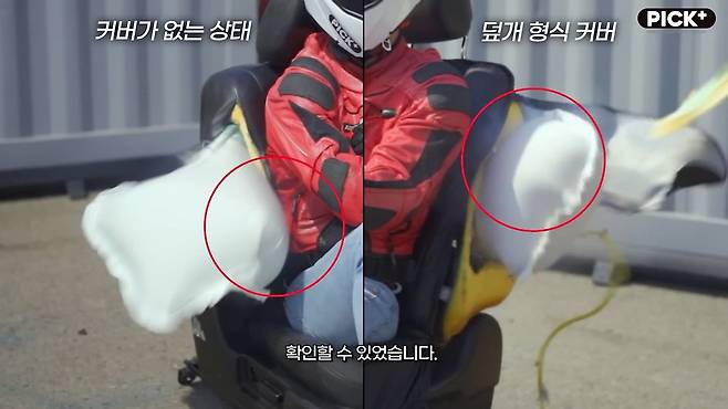 마지막으로 시트 전체를 덮어서 사용하는 덮개형 시트커버를 시트에 장착한 후 동일하게 에어백을 작동시켜보았습니다. 이번에도 에어백이 제대로 작동을 하였지만, 시트커버가 에어백의 방향을 방해하여 탑승자의 옆구리에 제대로 도달하지 못하는 모습을 볼 수 있었습니다. 사고 시에 사이드에어백이 탑승자를 보호하고, 잡아주는 역할을 제대로 해내지 못할 수 있는 상황이었습니다.