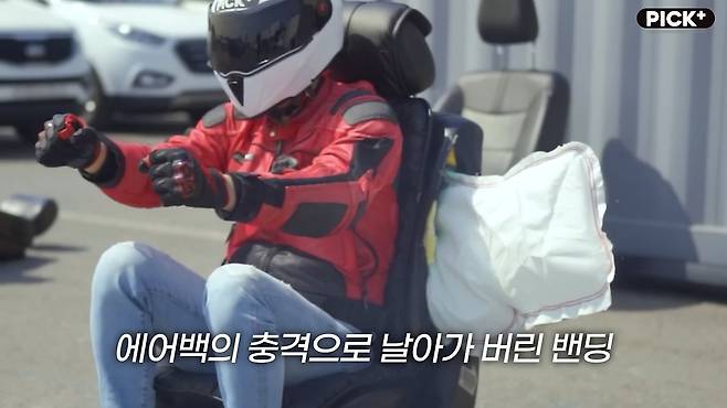 마지막으로 시트 전체를 덮어서 사용하는 덮개형 시트커버를 시트에 장착한 후 동일하게 에어백을 작동시켜보았습니다. 이번에도 에어백이 제대로 작동을 하였지만, 시트커버가 에어백의 방향을 방해하여 탑승자의 옆구리에 제대로 도달하지 못하는 모습을 볼 수 있었습니다. 사고 시에 사이드에어백이 탑승자를 보호하고, 잡아주는 역할을 제대로 해내지 못할 수 있는 상황이었습니다.