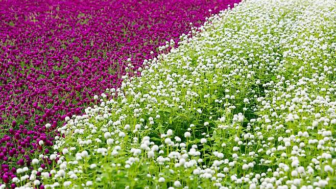 ‘변치 않는 사랑’이라는 꽃말을 가진 천일홍이 끝없이 이어지는 장면은 그야말로 보랏빛 황홀경입니다.