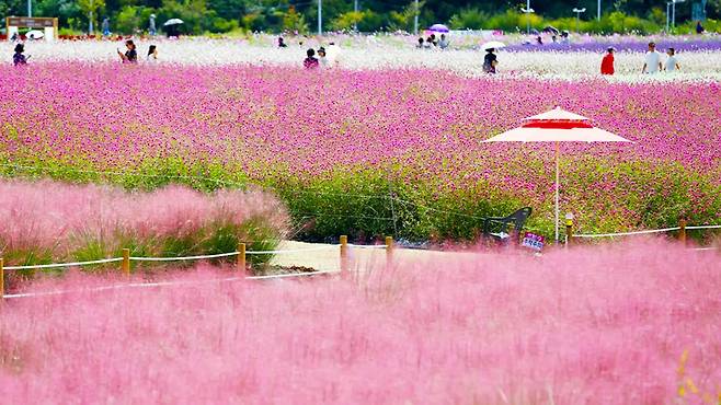 여기에 전국 4대 명소로 꼽히는 핑크뮬리 군락지, 붉게 물드는 댑싸리(코키아), 바람에 춤추는 팜파스 그라스, 그리고 맨드라미·아스타·가우라 등 50여 종의 가을꽃들이 어우러져 한 폭의 그림 같은 풍경을 완성합니다.