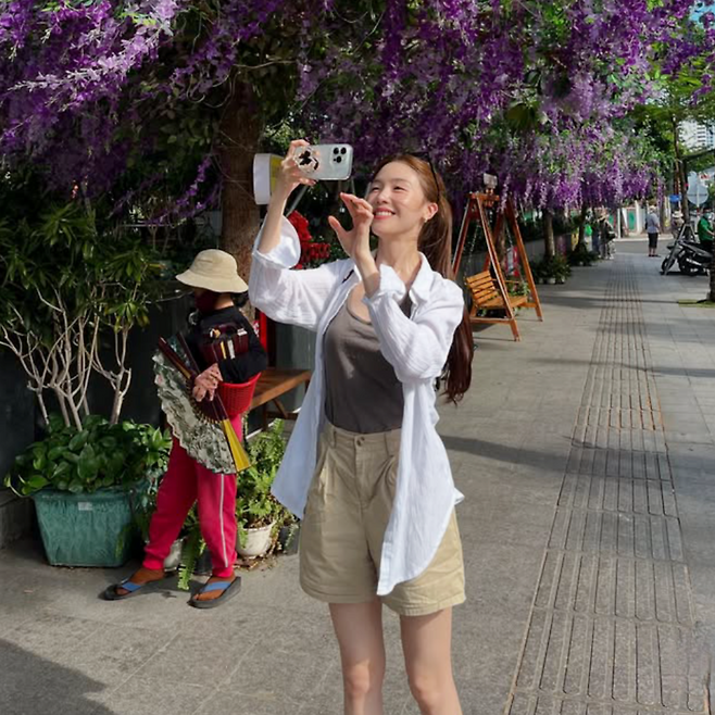 셔츠는 햇살이 비치면 살짝 비침이 느껴지는 시원한 소재. 루즈한 핏 덕분에 바람에 살랑이는 느낌이 살아 있다. 민소매는 바디에 적당히 밀착돼 깔끔한 인상을 주며, 팬츠는 하이웨이스트 디자인으로 활동성과 안정감 둘 다 잡았다.